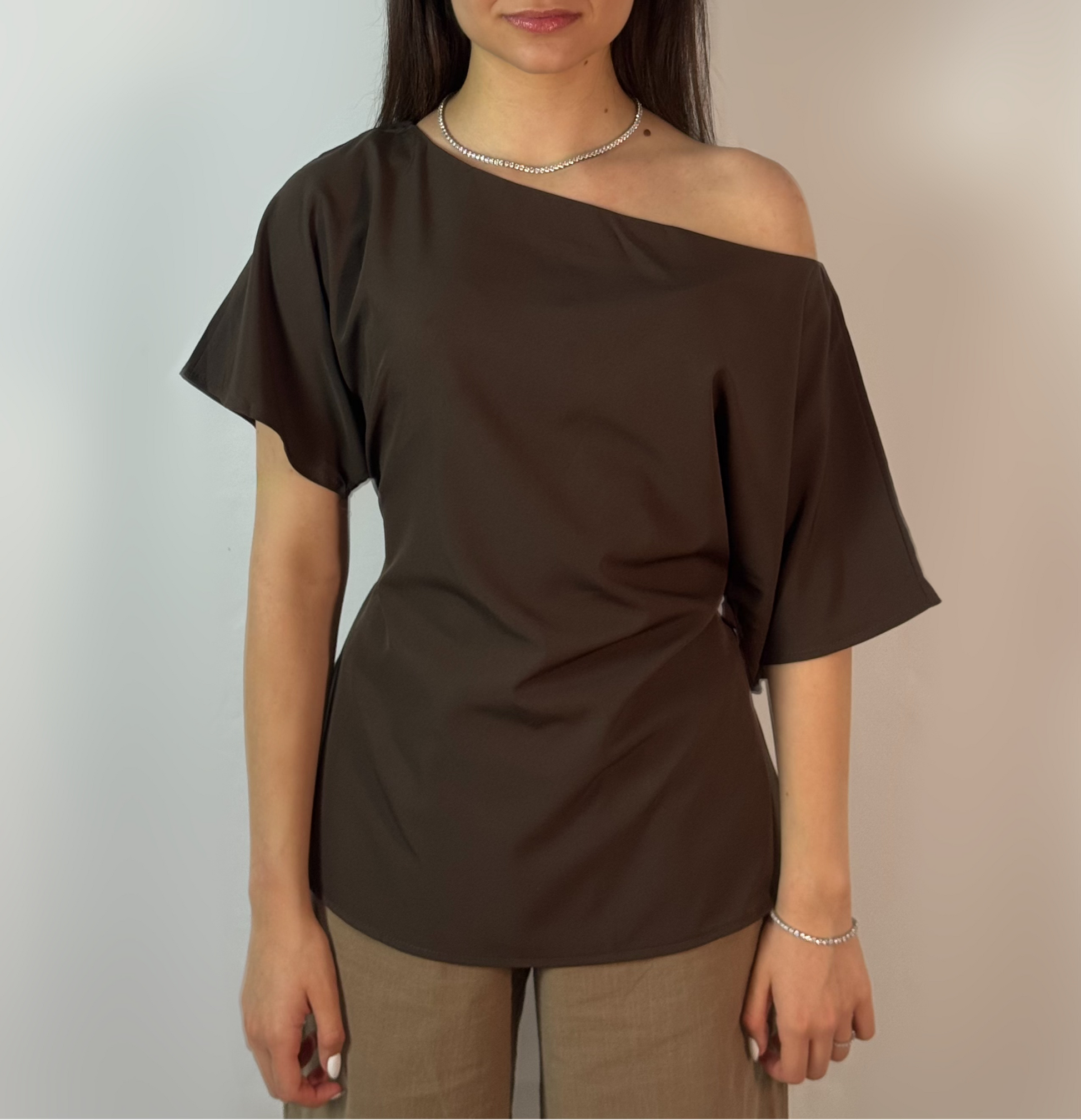 Moira este intensitate și discreție în aceeași măsură. Nuanța de maro profund și croiala cu un singur umăr descoperit definesc o estetică puternică, dar subtilă. Este bluza care îți oferă posibilitatea de a exprima feminitatea printr-un detaliu minimalist, transformând un outfit obișnuit într-o apariție memorabilă. DALANA a creat Moira pentru femeia care apreciază luxul discret, care știe că adevărata eleganță nu are nevoie de ornamente. Este o piesă ușor de integrat, dar imposibil de ignorat, destinată celor care caută echilibrul perfect între simplitate și rafinament.